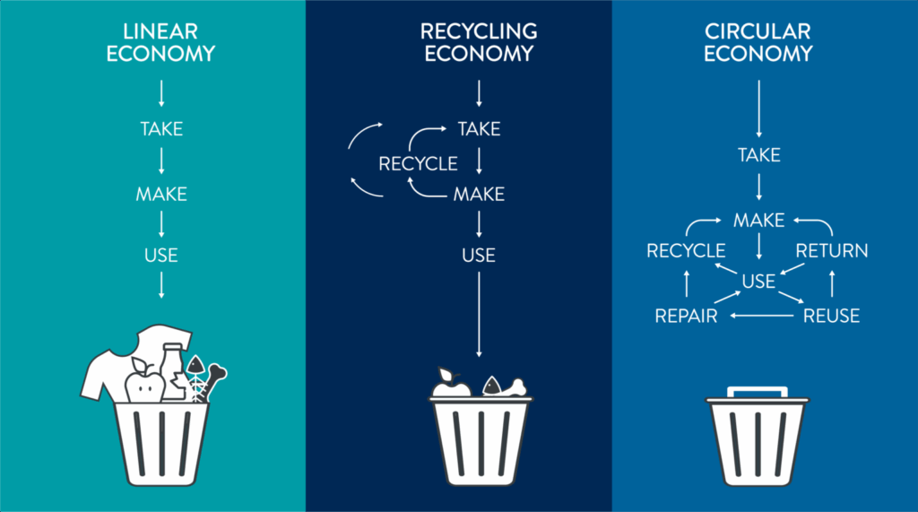 Our current ‘throwaway economy’ operates on a linear trajectory that can be described as “take-make-waste”. Raw materials and resources are extracted, processed into products, used, and then discarded as waste.
